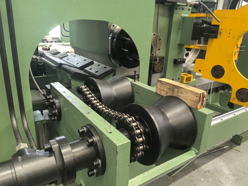 Internally, the machine features a gear-driven anti-backlash transmission and spline-connected blade flange for smooth torque delivery. Vertical clamping is handled by fixed and floating clamps with hydraulic actuation.